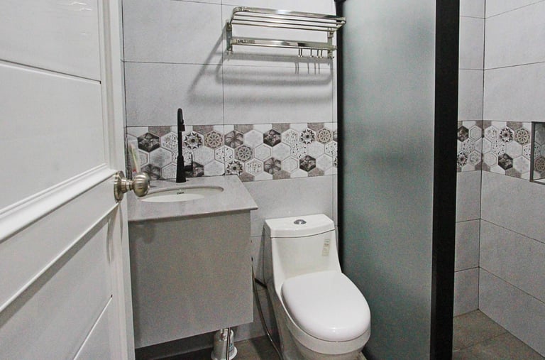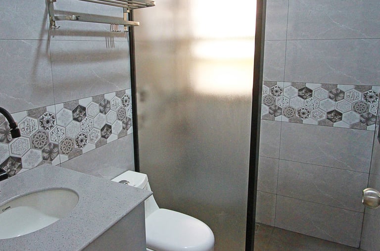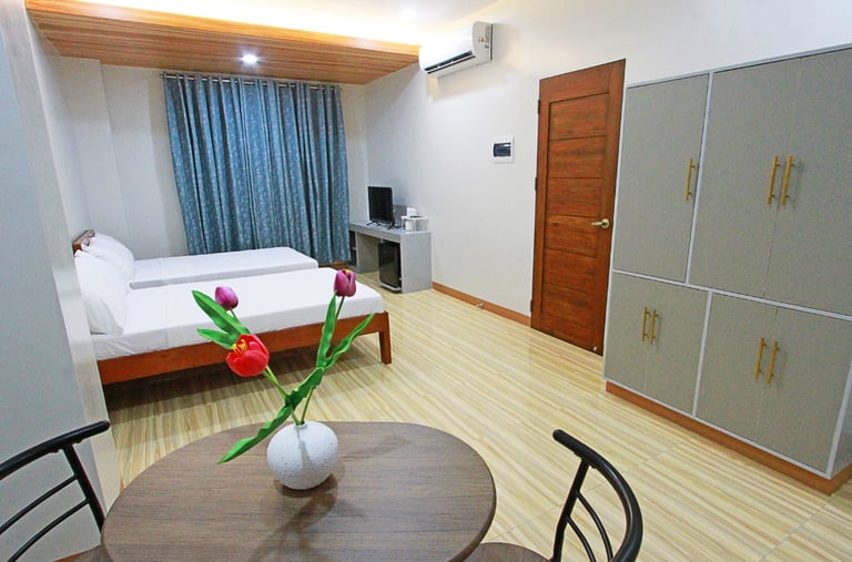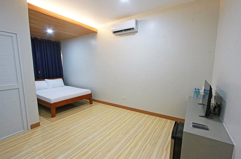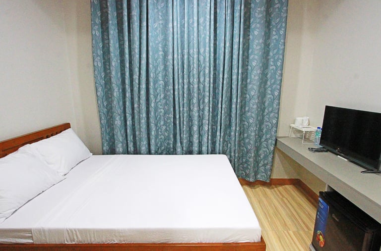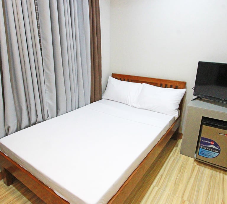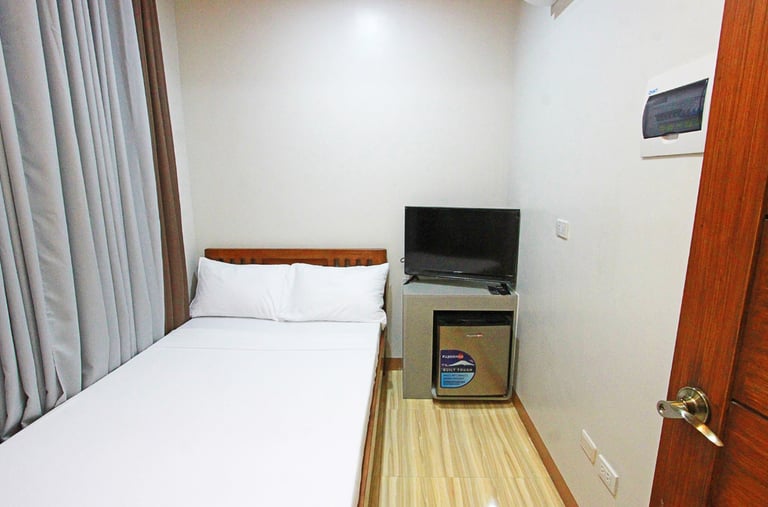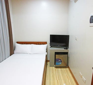 Designed for comfort and practicality, ideal for solo travelers or couples. It includes one cozy semi-double bed, a small cabinet, a 36 in. TV, and a mini refrigerator for convenience.The private bathroom features a sink, toilet, and shower with hot and cold water, ensuring a refreshing stay. Perfect for a hassle-free experience.