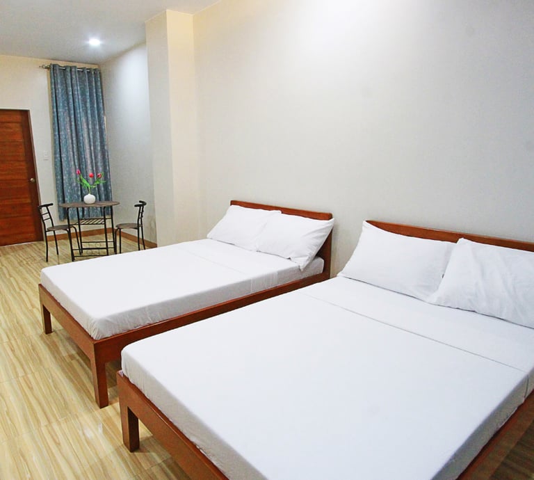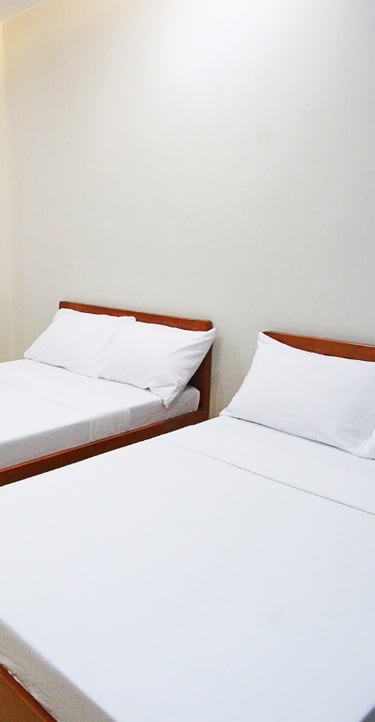 Designed for families or small groups. It includes two semi-double cozy beds, a mini balcony with street and mountain views, a small cabinet, TV, and a mini refrigerator for added ease. The private bathroom features a sink, toilet, shower, and water heater, ensuring a refreshing stay. Ideal for both short and extended visits.